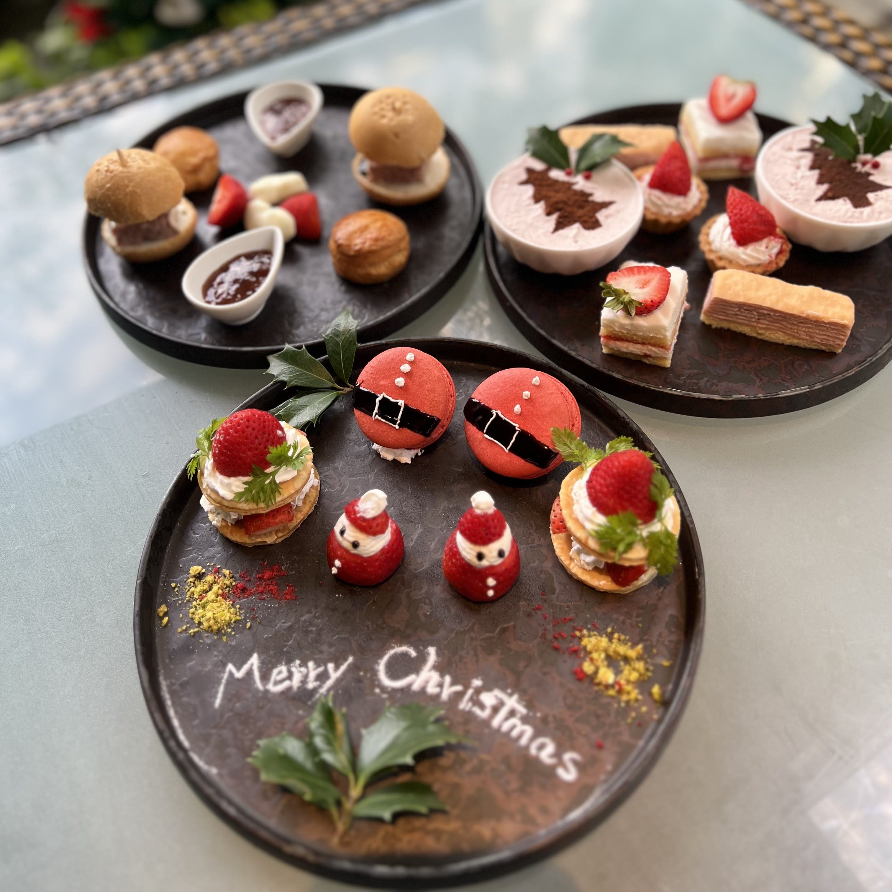 12月1日~25日限定、苺のサンタクロースやマカロンなどを散りばめたクリスマス限定のアフタヌーンプラン